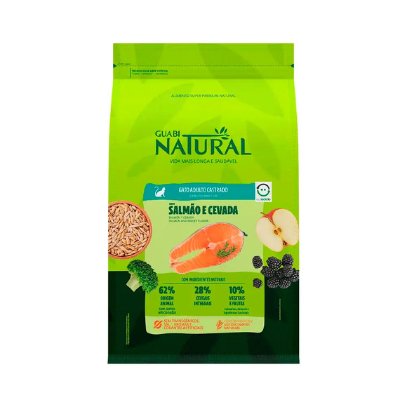 Ração Guabi Natural Gatos Adultos Castrados Salmão e CevadaGatos castrados possuem necessidades especiais provenientes dessa cirurgia e precisam que a alimentação seja rica e balanceada para uma vida mais saudável. A Ração Guabi Natural Gatos Adultos Castrados Salmão e Cevada foi desenvolvida por especialistas em nutrição para ser livre de transgênicos, corantes e aromatizantes artificiais.A Ração Guabi Natural para Gatos Castrados é uma fonte rica em ômega 3 e 6 que contribuem para a pele e pelagem mais bonita e conta com fibras e prebióticos que auxiliam na saúde intestinal e formação adequada de fezes possibilitando uma vida mais longa e saudável.Na você encontra a maior variedade de alimentos para seu pet como a Ração Guabi Natural Gatos Adultos Castrados Salmão e Cevada com preço especial. Compre pelo site, app ou em uma de nossas lojas.IngredientesSeleção de Ingredientes de Origem Animal, mín. 62% (dos quais mín. 16% são Carnes Selecionadas: Carne Mecanicamente Separada de Salmão, Carne Mecanicamente Separada de Frango e Fígado de Frango. Farinha de Vísceras de Aves, Farinha de Torresmo, Ovo em Pó, Óleo de Vísceras de Aves, Gordura Suína, Óleo de Peixe Refinado, Hidrolisado de Fígado Ave e Suíno). Seleção de Cereais Integrais, mín. 28% (Arroz Integral, Grão de Aveia, Cevada em Grão, Grão de Sorgo). Seleção de Vegetais, Frutas, Vitaminas, Minerais e Ingredientes Funcionais, máx. 10% (dos quais máx. 5% são Vegetais e Frutas Selecionados: Ervilha, Brócolis Desidratado, Espinafre Desidratado, Cenoura Desidratada, Mirtilo Desidratado “Blueberry”, Amora Desidratada, Maçã Desidratada, Manga Desidratada, Polpa de Beterraba, Farinha da Alga Schizochytrium sp., Semente de Psyllium, Fibra de Cana-de-Açúcar, Casca de Aveia Moída, Levedura Seca de Cervejaria, Óleo de Linhaça. Cloreto de Potássio, Carbonato de Cálcio, L-Lisina, Taurina, DL-Metionina, L- Carnitina, Propionato de Cálcio, Sorbato de Potássio, Aditivo Acidificante: Ácido Fosfórico. Aditivos Prebióticos: Inulina e Parede Celular de Levedura Fonte de Mananoligossacarídeos. Antioxidantes Naturais: Extrato de Alecrim e Concentrado de Tocoferóis. Aditivo Adsorvente: Parede Celular de Levedura e Bentonita. Vitaminas: A, D3, E, K3, C, B1, B2, B6, B12, Pantotenato de Cálcio, Ácido Fólico, Ácido Nicotínico, Biotina, Cloreto de Colina. Minerais: Sulfato de Zinco, Sulfato de Ferro, Sulfato de Manganês, Iodato de Cálcio. Minerais Quelatados: Proteinato de Manganês, Levedura Enriquecida com Selênio, Proteinato de Zinco, Proteinato de Cobre).Níveis de GarantiaProteína Bruta (mín.)360g/kg36%Matéria Fibrosa (máx.)50g/kg5,0%Matéria Mineral (máx.)80g/kg8,0%Extrato Etéreo (mín.)120g/kg12%Cálcio (máx.)16g/kg1,6%Cálcio (mín.)8.000mg/kg0,8%Fósforo (mín.)8.000mg/kg0,8%Umidade (máx.)90g/kg9,0%Lisina (mín.)12g/kgÔmega 3 (mín.)2.000mg/kgÔmega 6 (mín.)20g/kgEnergia metabolizável (mín.)3.800kcal/kgEnriquecimento Mínimo por KgVitamina A: 15.400UI, Vitamina D3: 447UI, Vitamina E: 600UI, Vitamina K3: 0,1mg, Vitamina C: 200mg, Vitamina B1: 9mg, Vitamina B2: 5,1mg, Vitamina B6: 4mg, Vitamina B12: 29µg, Pantotenato de Cálcio: 9,3mg, Ácido Fólico: 1,2mg, Ácido Nicotínico: 51mg, Biotina: 0,11mg, Colina: 1.430mg, Zinco: 83mg, Ferro: 88mg, Manganês: 11mg, Iodo: 2mg, Selênio: 0,33mg, Cobre: 11mg.Guia para troca de raçãoCaso haja necessidade em inserir uma nova ração para seu pet, é importante que a troca seja gradual e crescente. Para garantir uma perfeita adaptação e aceitação, você pode seguir a sugestão abaixo ou conforme orientação do médico-veterinário: