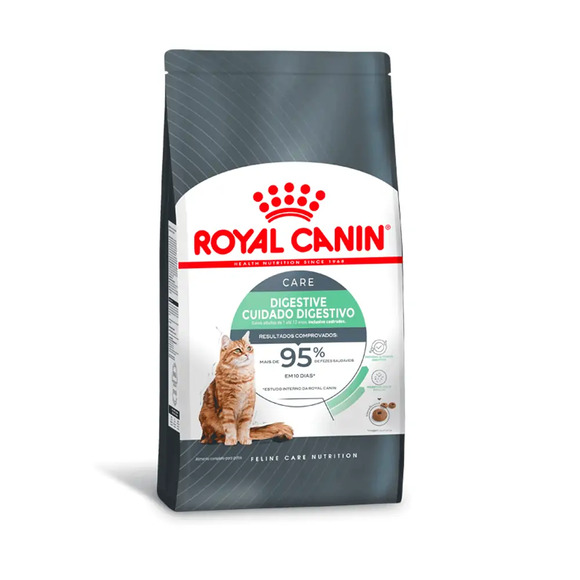 Ração Royal Canin Cuidado Digestivo Gatos AdultosCuidar da saúde do seu pet é muito importante. Pensando nisso a Ração Royal Canin Cuidado Digestivo Gatos Adultos um alimento completo super premium indicada para gatos adultos com tendência a uma má digestão.Fórmula nutricional equilibrada com precisão que apoia a saúde digestiva através de nutrientes especialmente adaptados e de um formato de croquete exclusivo. Contém proteínas com uma elevada digestibilidade para tornar a digestão mais fácil, o que contribui para a sua boa saúde geral.Também contém uma mistura específica de prebióticos e fibras para ajudar a suportar o equilíbrio da flora intestinal e a regular o trânsito intestinal. A quantidade de proteínas contida é muito elevada e é de elevada qualidade de forma a ajudar a manter a força muscular interna em todo o corpo e a manter a consistência da qualidade das fezes, o que também ajuda a regular e a reduzir o seu tempo de excreção. Além disso, apoia uma digestão saudável com um croquete em forma de anel que retarda naturalmente o processo de comer e de mastigar, minimizando o risco de indigestão.A utilização exclusiva do Digestive Care foi eficaz após apenas 10 dias, resultando numa redução de 49% da produção de fezes graças ao consumo de nutrientes e a uma digestão substancialmente otimizados (estudo interno Royal Canin).Compre a Ração Royal Canin Cuidado Digestivo com um preço incrível que só a pode oferecer! No site, no app ou nas nossas lojas físicas.Ingredientes:Glúten de trigo, farinha de vísceras de aves, quirera de arroz, farinha de mandioca, farinha de trigo, gordura suína, gordura de frango, milho integral moído*, fibra de soja*, polpa de chicória seca, óleo branqueado e desodorizado de peixes, óleo de soja refinado*, casca de psyllium (0,2%), cloreto de potássio, cloreto de sódio (sal comum), fosfato monocálcico, fruto-oligossacarídeos (0,21%), zeolita, retinol (vitamina A), ácido ascórbico (vitamina C), colecalciferol (vitamina D3), acetato de d-alfa tocoferol (vitamina E), cloridrato de tiamina (vitamina B1), riboflavina (vitamina B2), cloridrato de piridoxina (vitamina B6), cianocobalamina (vitamina B12), ácido nicotínico (niacina), ácido pantotênico, biotina, ácido fólico, cloreto de colina, sulfato de cálcio, sulfato de ferro, sulfato de cobre, óxido de zinco, óxido de manganês, iodato de cálcio, levedura enriquecida com selênio, zinco aminoácido quelato, manganês aminoácido quelato, cobre aminoácido quelato, taurina, palatabilizante à base de fígado de frango, antioxidante (BHA).Níveis de Garantia:Umidade (máx.)75 g/kg7,5%Proteína Bruta (mín.)360 g/kg36%Extrato Etéreo (mín.)130 g/kg13%Matéria Fibrosa (máx.)35 g/kg3,5%Matéria Mineral (máx.)97 g/kg9,7%Cálcio (mín.)5.760 mg/kg0,576%Cálcio (máx.)13,44 g/kg1,344%Fósforo (mín.)4.680 mg/kg0,468%Sódio (mín.)3.660 mg/kg0,366%Cloro (mín.)6.180 mg/kg0,618%Potássio (mín.)4.380 mg/kg0,438%Magnésio (mín.)300 mg/kg0,03%Taurina (mín.)1.050 mg/kg0,105%Energia metabolizável4.000 kcal/kgEnriquecimento Mínimo por Kg:Vitaminas: A: 10.560 UI, C: 180 mg, D3: 540 UI, E: 360 UI, B1: 9,6 mg, B2: 35,82 mg, B6: 15,84 mg, B12: 96 µg, PP: 120 mg, Ácido Pantotênico: 33,06 mg, Biotina: 1,014 mg, Ácido Fólico: 2,58 mg, Colina: 1.320 mg.Minerais: Cobre: 7,2 mg, Ferro: 24 mg, Manganês: 31,2 mg, Iodo: 2,4 mg, Zinco: 93,6 mg, Selênio: 0,024 mg.Guia para troca de raçãoCaso haja necessidade em inserir uma nova ração para seu pet, é importante que a troca seja gradual e crescente. Para garantir uma perfeita adaptação e aceitação, você pode seguir a sugestão abaixo ou conforme orientação do médico-veterinário: